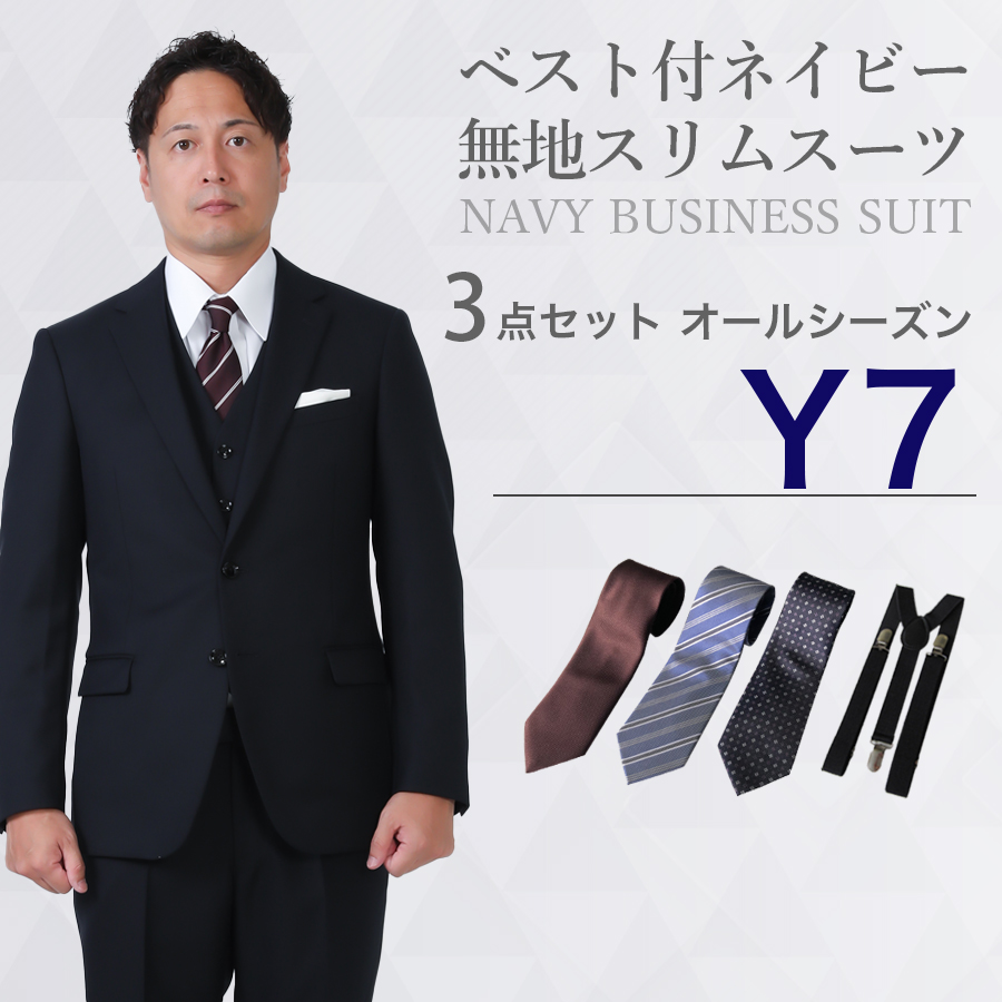 6. 【Y7サイズ】メンズ ベスト付ネイビー無地スリムスーツ3点セット 秋冬用スーツレンタル