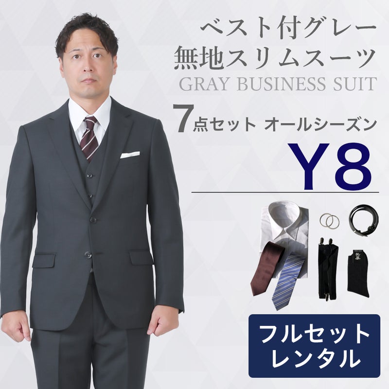 6. 【Y8サイズ】メンズ ベスト付グレー無地スリムスーツ7点セット 秋冬用レンタルスーツ