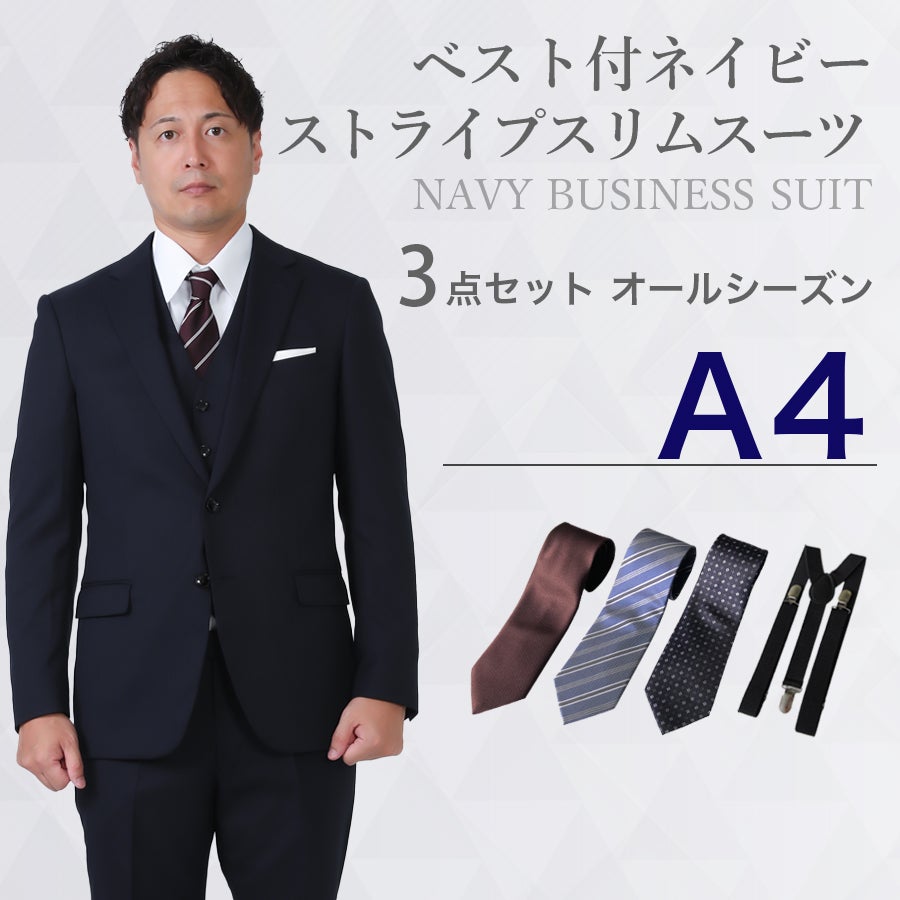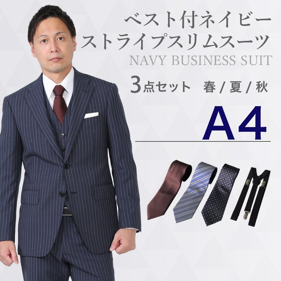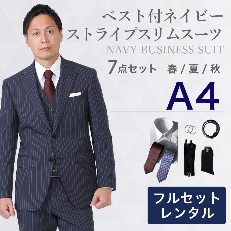 【A4サイズ】メンズ ベスト付ネイビーストライプスリムスーツ7点セット 秋冬用レンタルスーツ