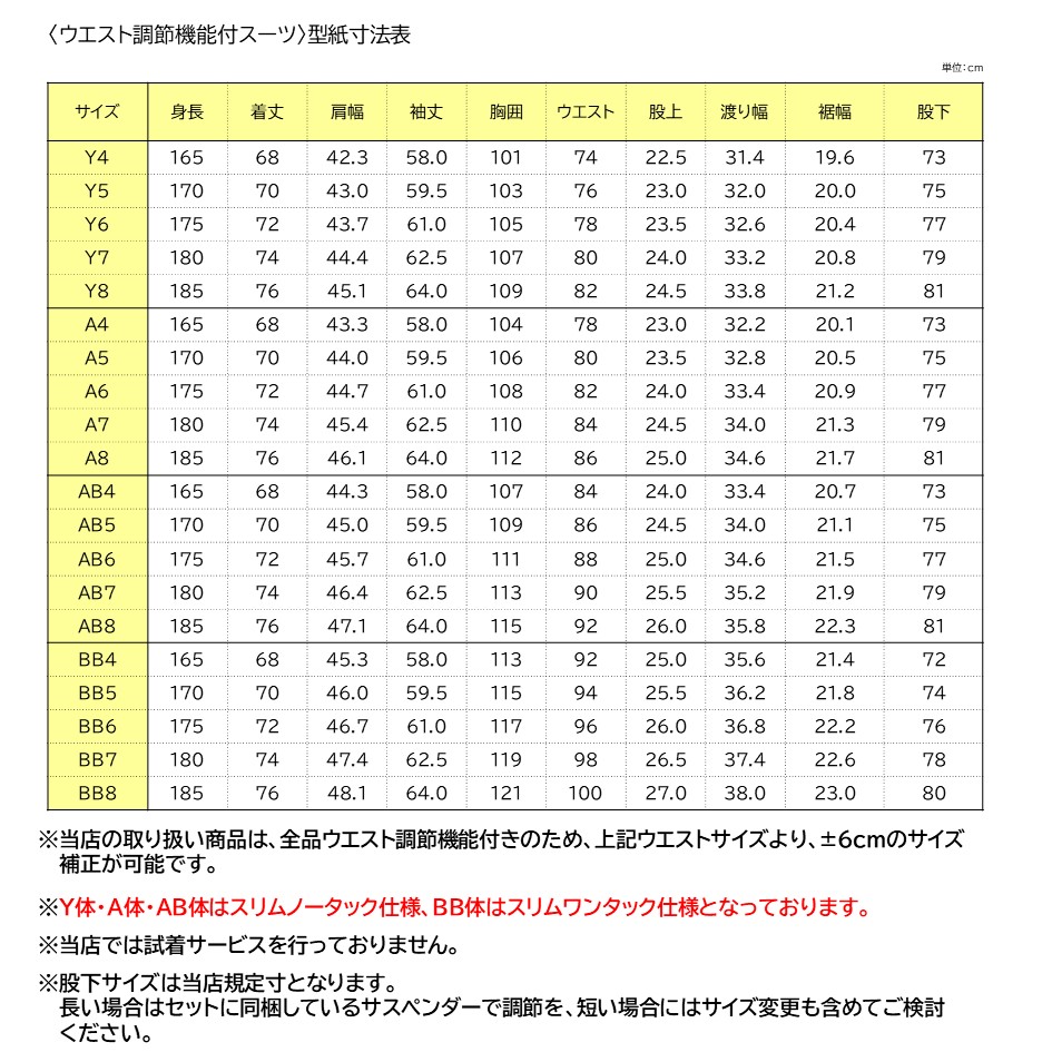 プラスマイナス6cm調節ができることから、初めてスーツを着られる方やサイズが不安な方にも安心して着用することができます!