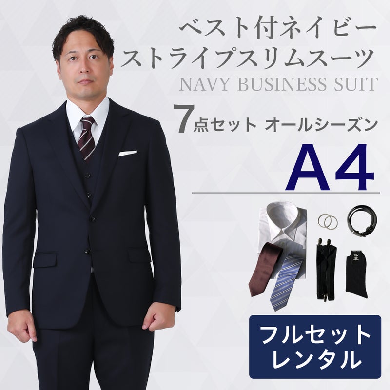 【A4サイズ】メンズ ベスト付ネイビーストライプスリムスーツ7点セット 秋冬用レンタルスーツ