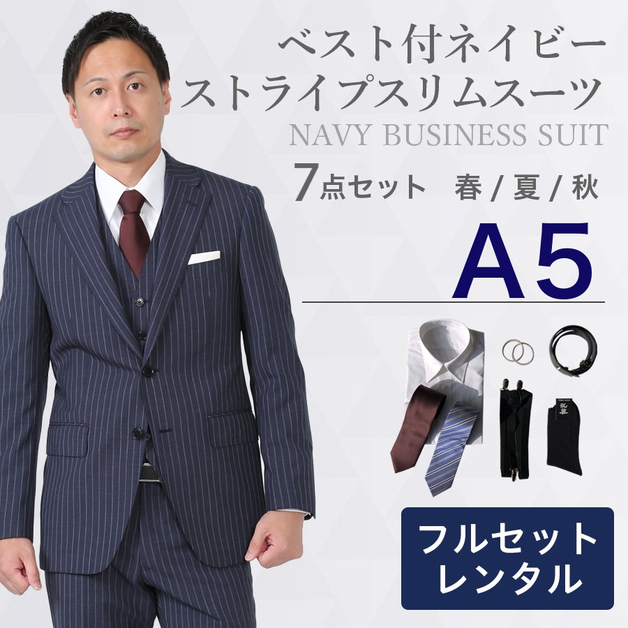 【A5サイズ】メンズ ベスト付ネイビーストライプスリムスーツ7点セット 秋冬用レンタルスーツ