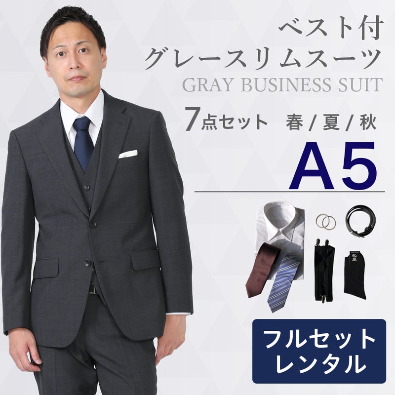 【レンタル】ベスト付グレースリムスーツ7点セット [男性用] [レンタル スーツ] [スーツ レンタル] [ビジネス] [無地] [リクルート] [面接用] [卒業式] [結婚式] [成人式] [3泊4日] [翌日配送] [当日発送] [送料無料] [FOL-3219101C-F]
