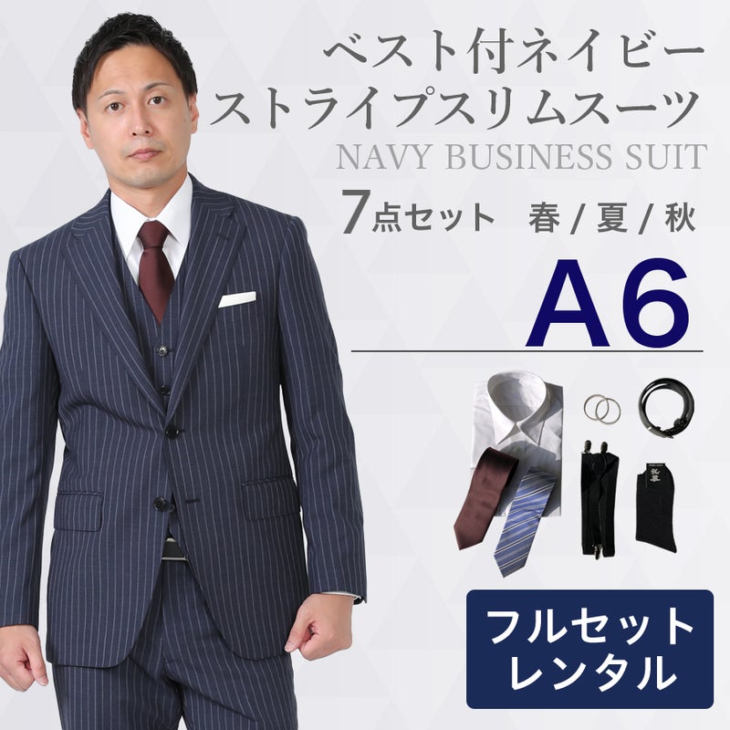6. 【A6サイズ】メンズ ベスト付ネイビー(ストライプ)スリムスーツ7点セット 喪服・礼服・フォーマルレンタル