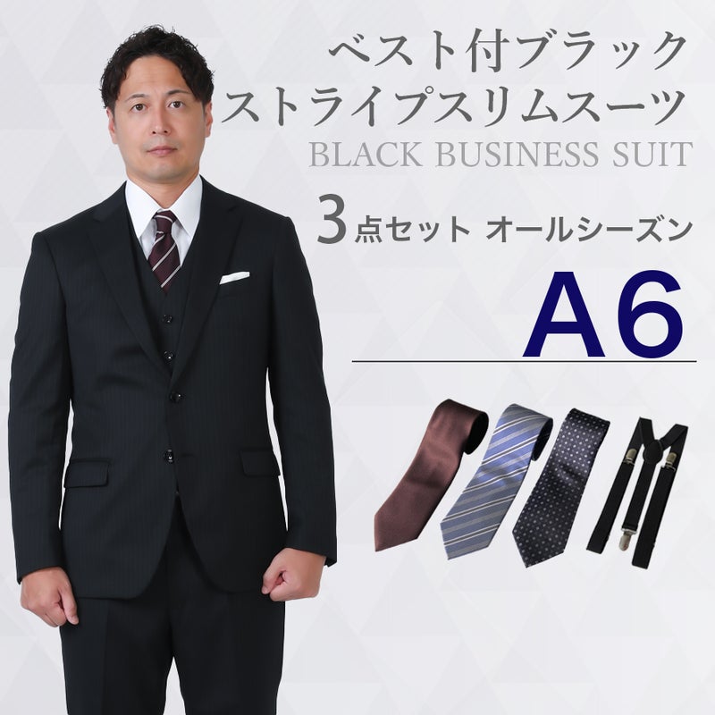 6. 【A6サイズ】メンズ ベスト付ブラックストライプスリムスーツ3点セット 秋冬用スーツレンタル