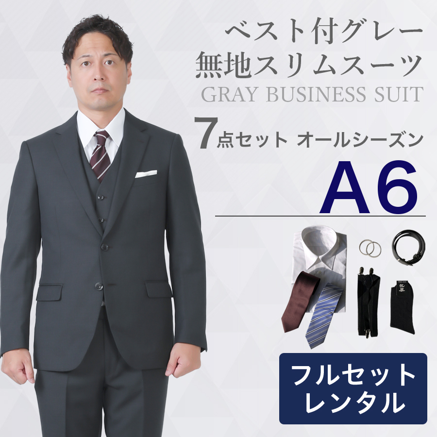 6. 【A6サイズ】メンズ ベスト付グレー無地スリムスーツ7点セット 秋冬用レンタルスーツ