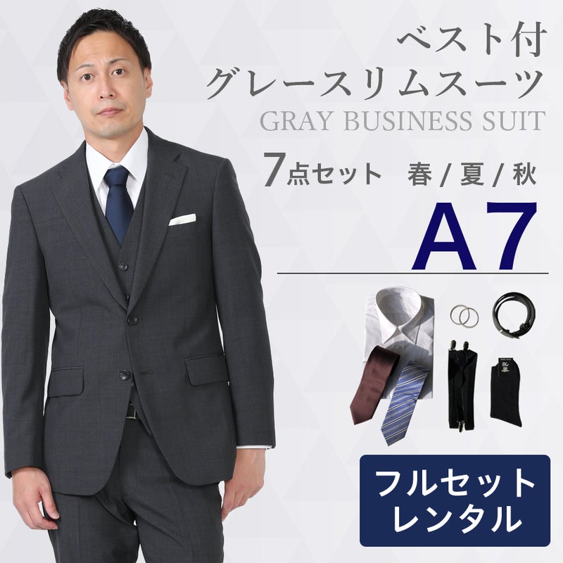 【レンタル】ベスト付グレースリムスーツ7点セット [男性用] [レンタル スーツ] [スーツ レンタル] [ビジネス] [無地] [リクルート] [面接用] [卒業式] [結婚式] [成人式] [3泊4日] [翌日配送] [当日発送] [送料無料] [FOL-3219101C-F]