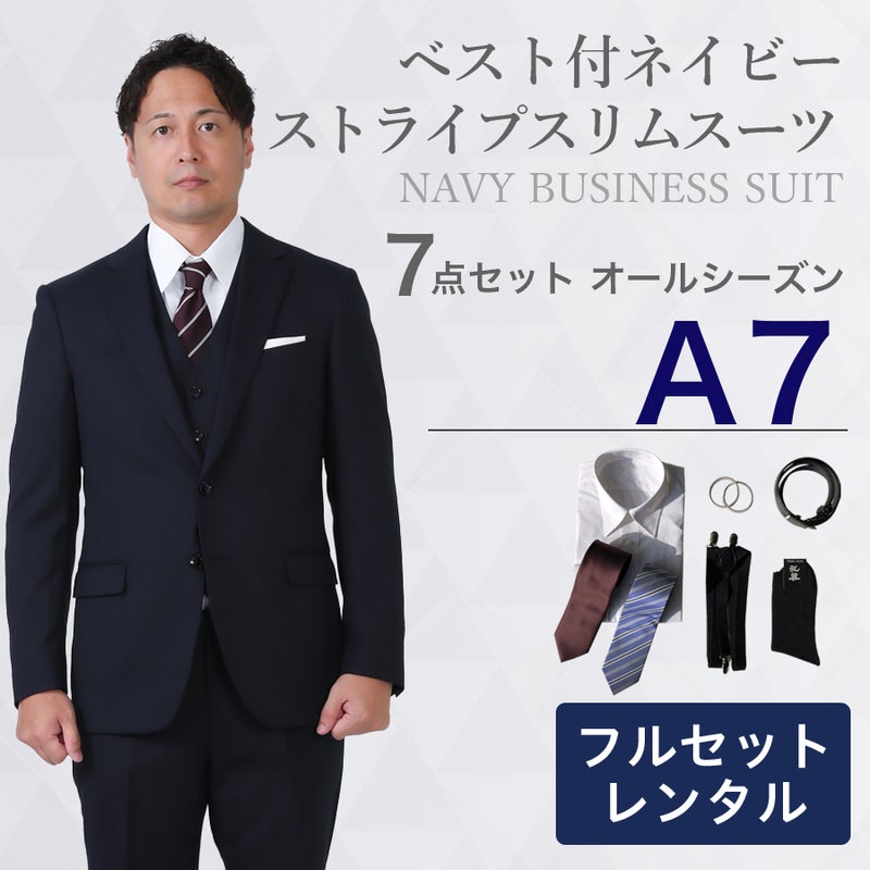 【A7サイズ】メンズ ベスト付ネイビーストライプスリムスーツ7点セット 秋冬用レンタルスーツ