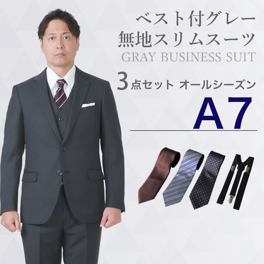 6. 【A7サイズ】メンズ ベスト付グレー無地スリムスーツ3点セット 秋冬用スーツレンタル