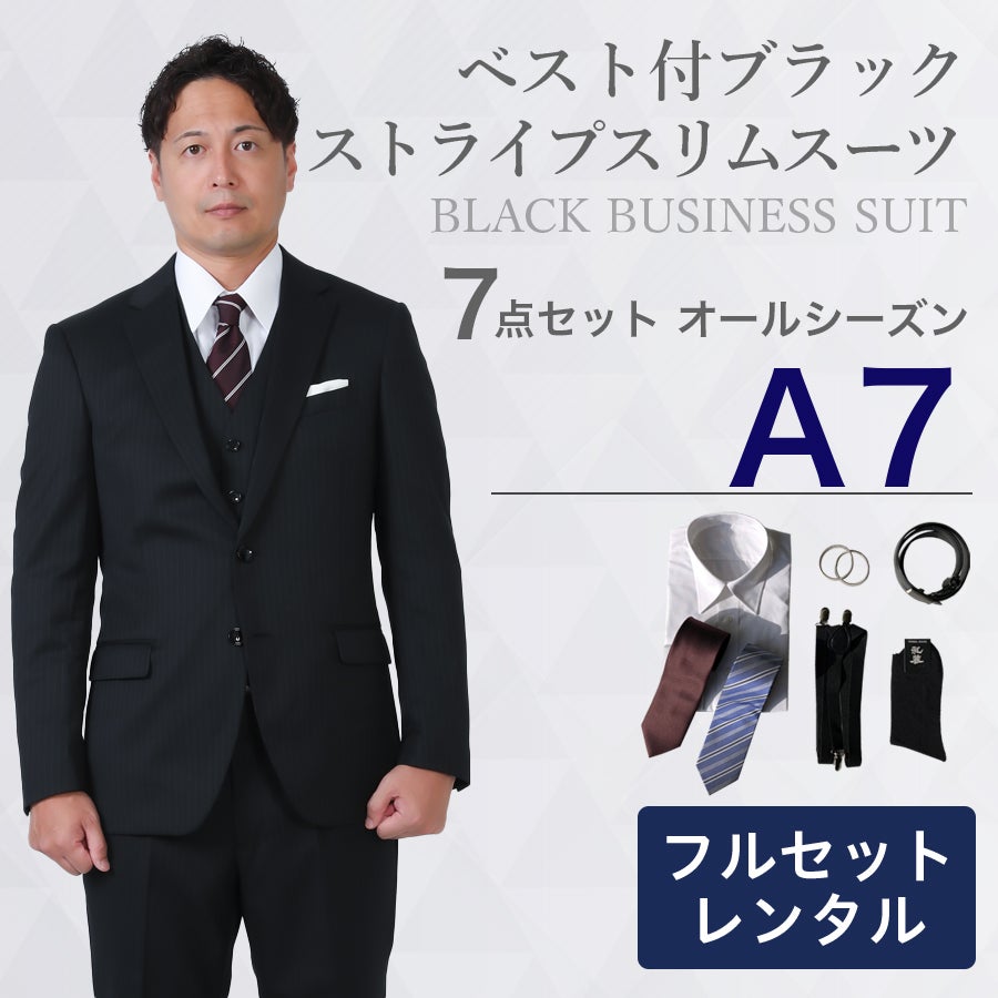 【A7サイズ】メンズ ベスト付ブラックストライプスリムスーツ7点セット 秋冬用レンタルスーツ