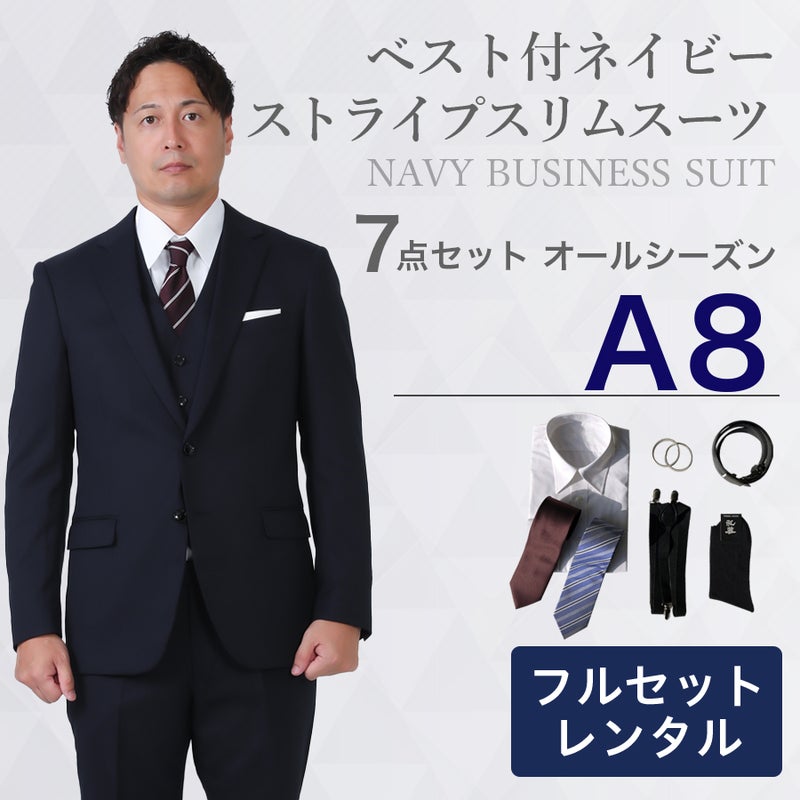 【A8サイズ】メンズ ベスト付ネイビーストライプスリムスーツ7点セット 秋冬用レンタルスーツ