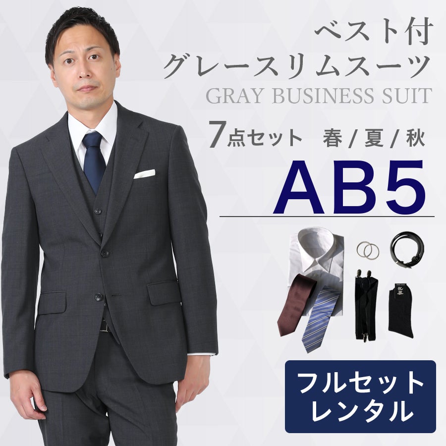 【AB5サイズ】メンズ ベスト付グレー無地スリムスーツ7点セット 秋冬用レンタルスーツ