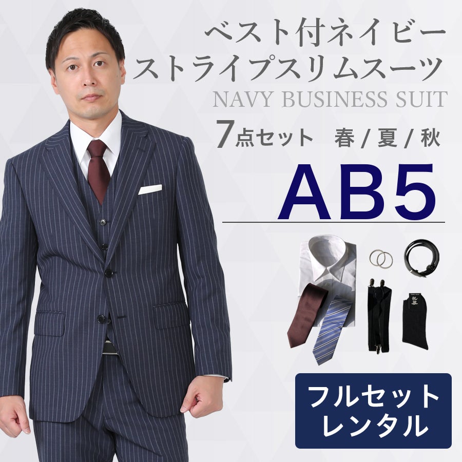 【AB5サイズ】メンズ ベスト付ネイビーストライプスリムスーツ7点セット 秋冬用レンタルスーツ