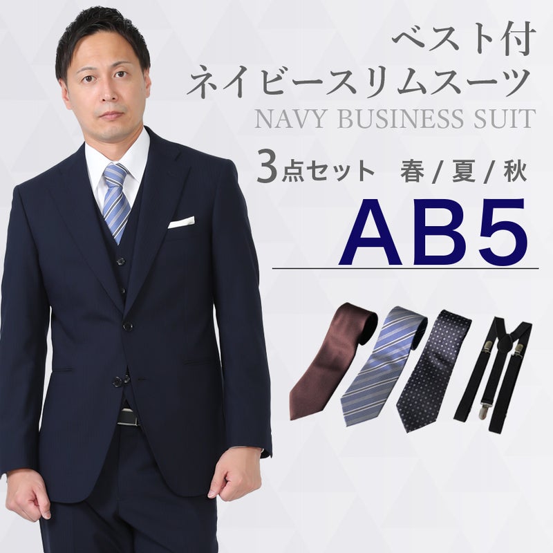 6. 【AB5サイズ】メンズ ベスト付ネイビー(濃)スリムスーツ3点セット 喪服・礼服・フォーマルレンタル