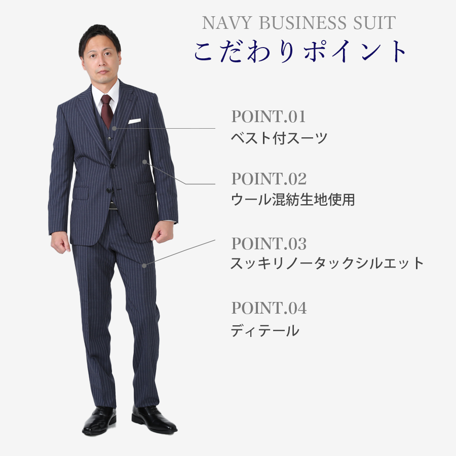 【AB6サイズ】メンズ ベスト付ネイビー(ストライプ)スリムスーツ7点セット 喪服・礼服・フォーマルレンタル
