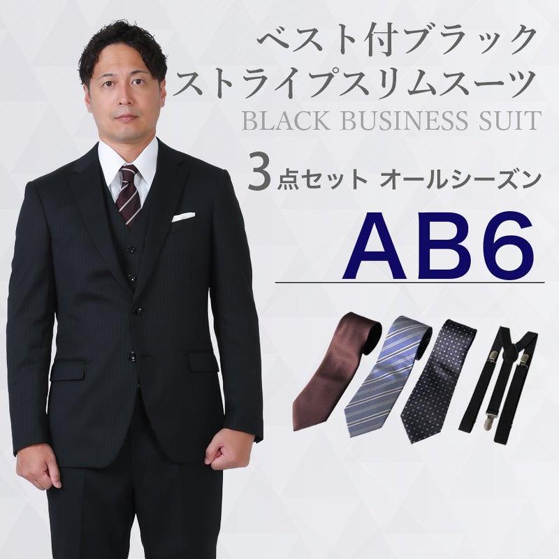 6. 【AB6サイズ】メンズ ベスト付ブラックストライプスリムスーツ3点セット 秋冬用スーツレンタル