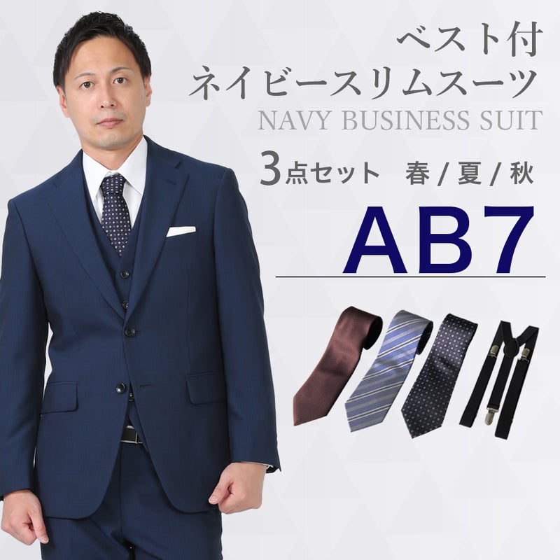 6. 【AB7サイズ】メンズ ベスト付ネイビー(薄)スリムスーツ3点セット 喪服・礼服・フォーマルレンタル