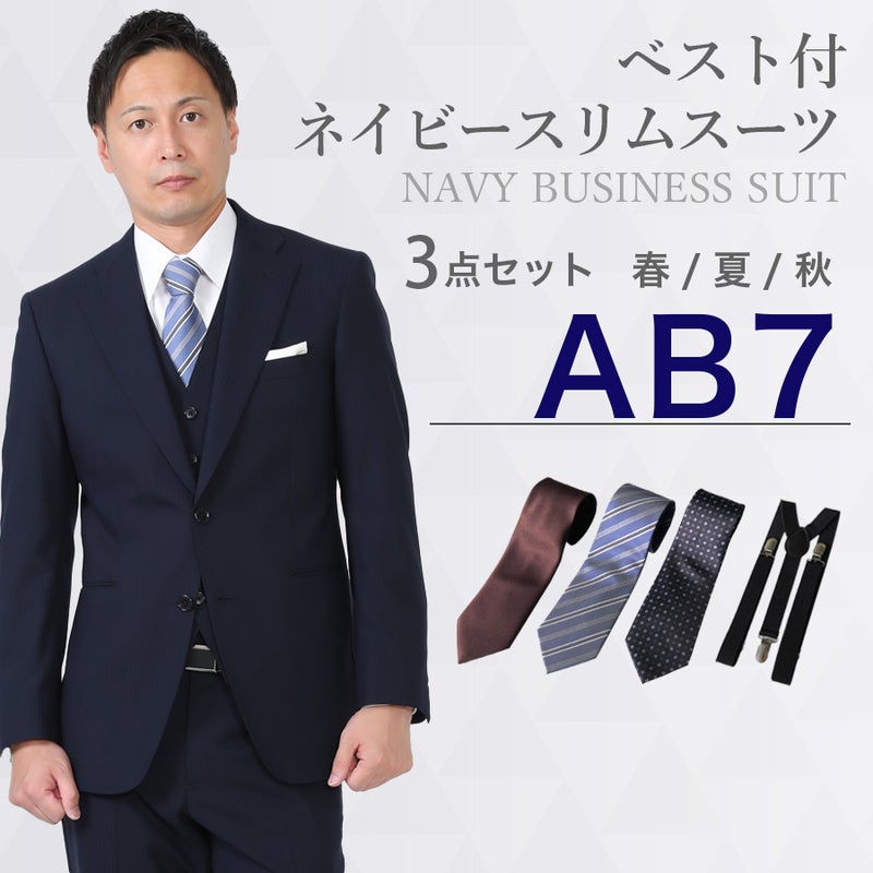 6. 【AB7サイズ】メンズ ベスト付ネイビー(濃)スリムスーツ3点セット 喪服・礼服・フォーマルレンタル