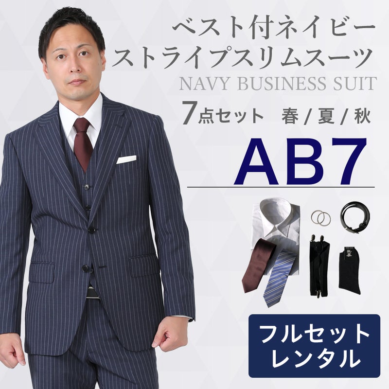 6. 【AB7サイズ】メンズ ベスト付ネイビー(ストライプ)スリムスーツ7点セット 喪服・礼服・フォーマルレンタル