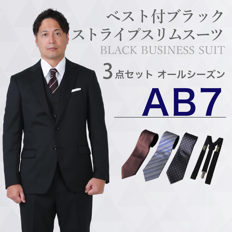 6. 【AB7サイズ】メンズ ベスト付ブラックストライプスリムスーツ3点セット 秋冬用スーツレンタル