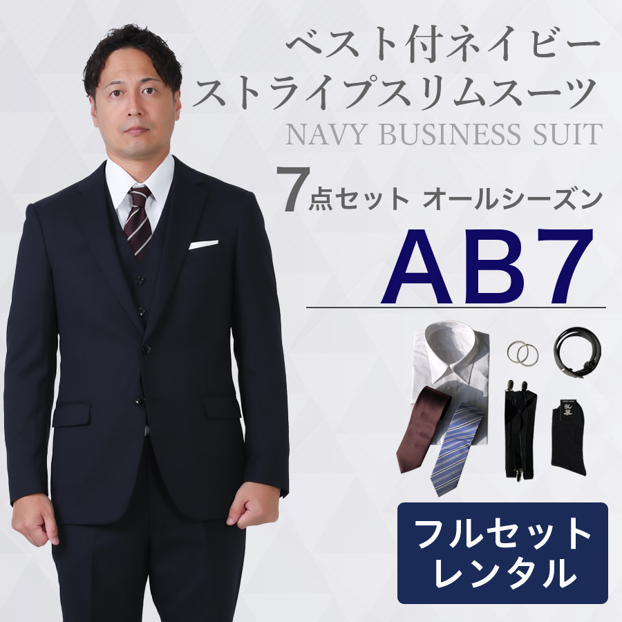 6. 【AB7サイズ】メンズ ベスト付ネイビーストライプスリムスーツ7点セット 秋冬用レンタルスーツ
