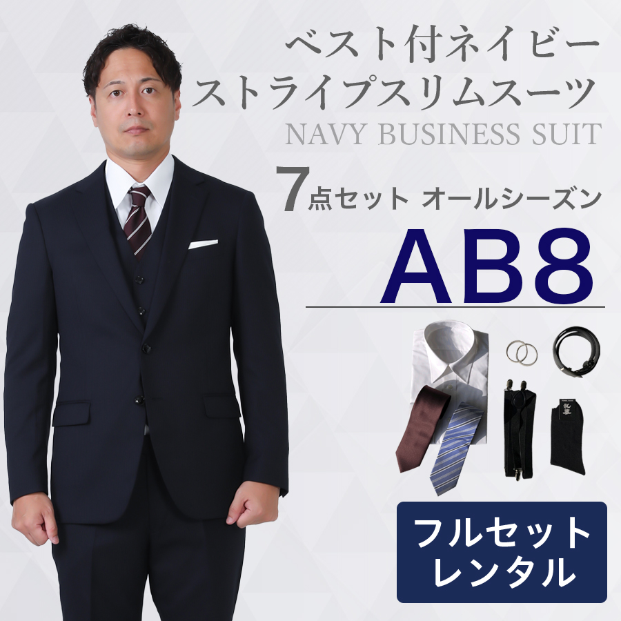【AB8サイズ】メンズ ベスト付ネイビーストライプスリムスーツ7点セット 秋冬用レンタルスーツ