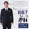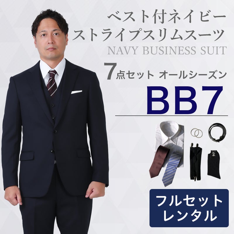 6. 【BB7サイズ】メンズ ベスト付ネイビーストライプスリムスーツ7点セット 秋冬用レンタルスーツ
