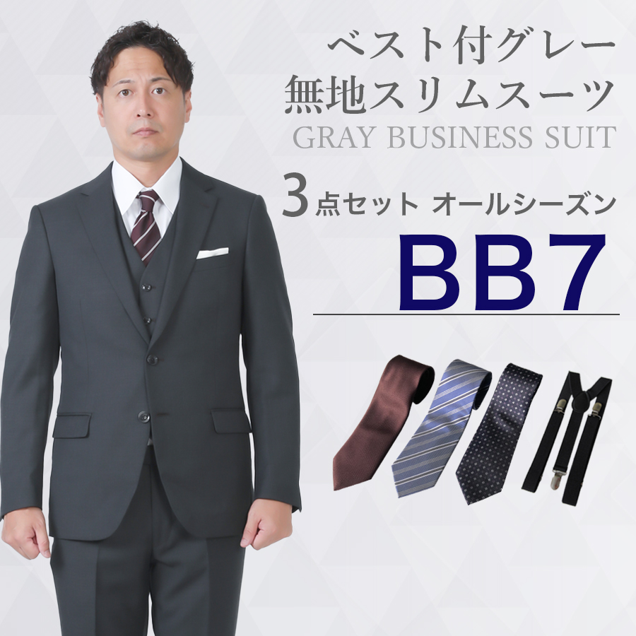 6. 【BB7サイズ】メンズ ベスト付グレー無地スリムスーツ3点セット 秋冬用スーツレンタル