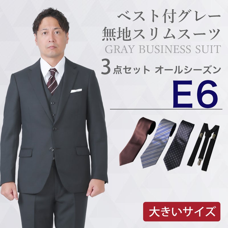 6. 【E6サイズ】メンズ 大きいサイズ用ベスト付グレー無地スリムスーツ3点セット 秋冬用スーツレンタル