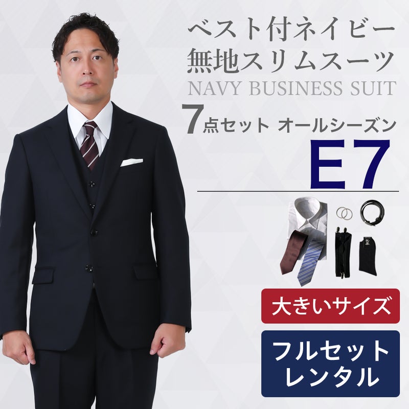【E7サイズ】メンズ 大きいサイズ用ベスト付ネイビー無地スリムスーツ7点セット 秋冬用スーツレンタル