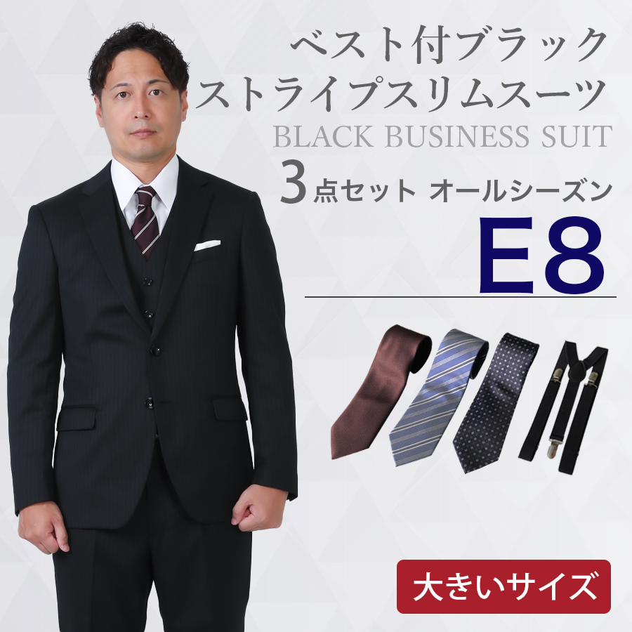 6. 【E8サイズ】メンズ 大きいサイズ用ベスト付ブラックストライプスリムスーツ3点セット 秋冬用スーツレンタル