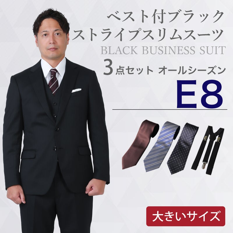 ★【大きいサイズ用】さまざまなシーンに対応するベスト付ブラックストライプスーツ・ウール混紡生地を使用し、柔らかさと質感も美しく晴れの日にぴったりの1着です。・かたちは細身のすっきりとしたシルエット。・仕事からリクルート、晴れの日(授業参観、七五三、成人式、結婚式)などなど幅広いシーンで活躍してくれること間違いありません!!
