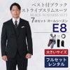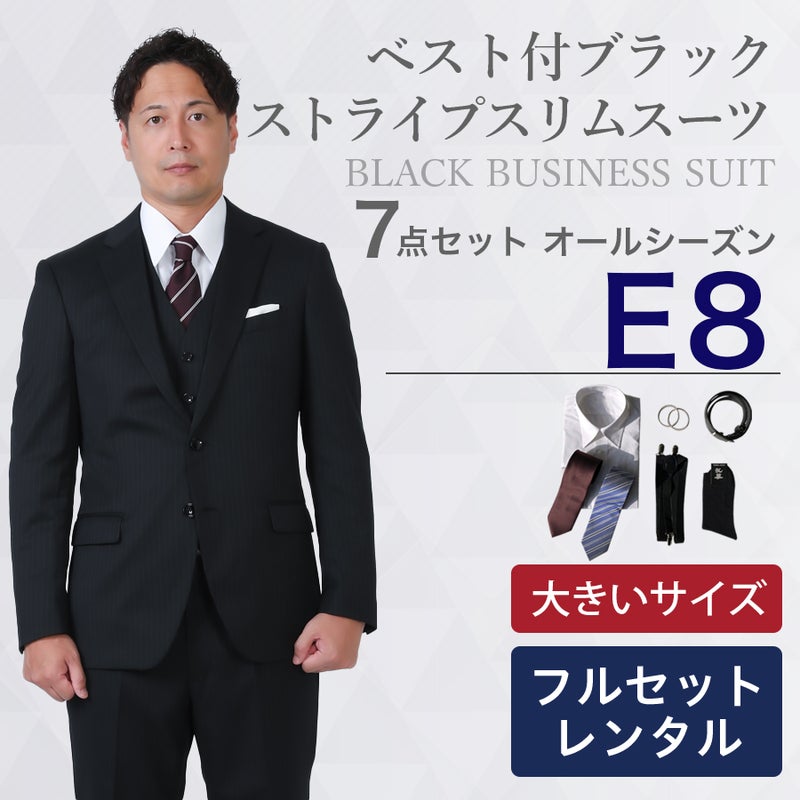 6. 【E8サイズ】メンズ 大きいサイズ用ベスト付ブラックストライプスリムスーツ7点セット 秋冬用スーツレンタル